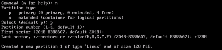 /dev/sda1 = /boot : 128MB (bootable, ∋ grub boot manager, kernel, decryption software (cryptsetup))
