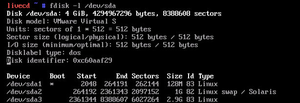 (나는 이미 3개의 파티션을 나눈 상태이기 때문에 sda1, sda2, sda3가 존재하지만, 처음에는 /dev/sda만 존재했었다.