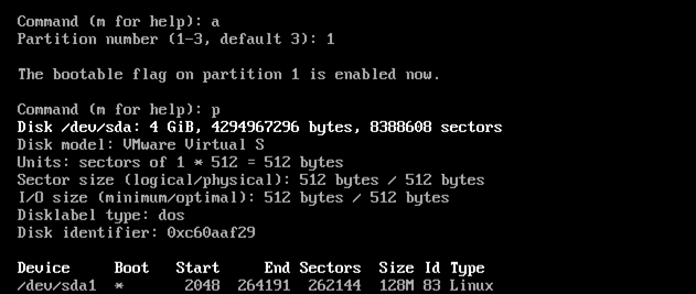 ↓↓↓ /dev/sda1에 bootable flag 지정해주기 (BIOS가 첫번째로 부팅해야하는 순서 알려줌)