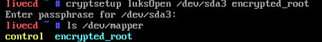 cryptsetup luksOpen /dev/sda3 [mapper이름]