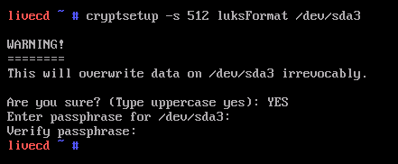 이제 마지막으로 /dev/sda3를 cryptsetup을 통해서 luks로 encrypt (암호화)한다