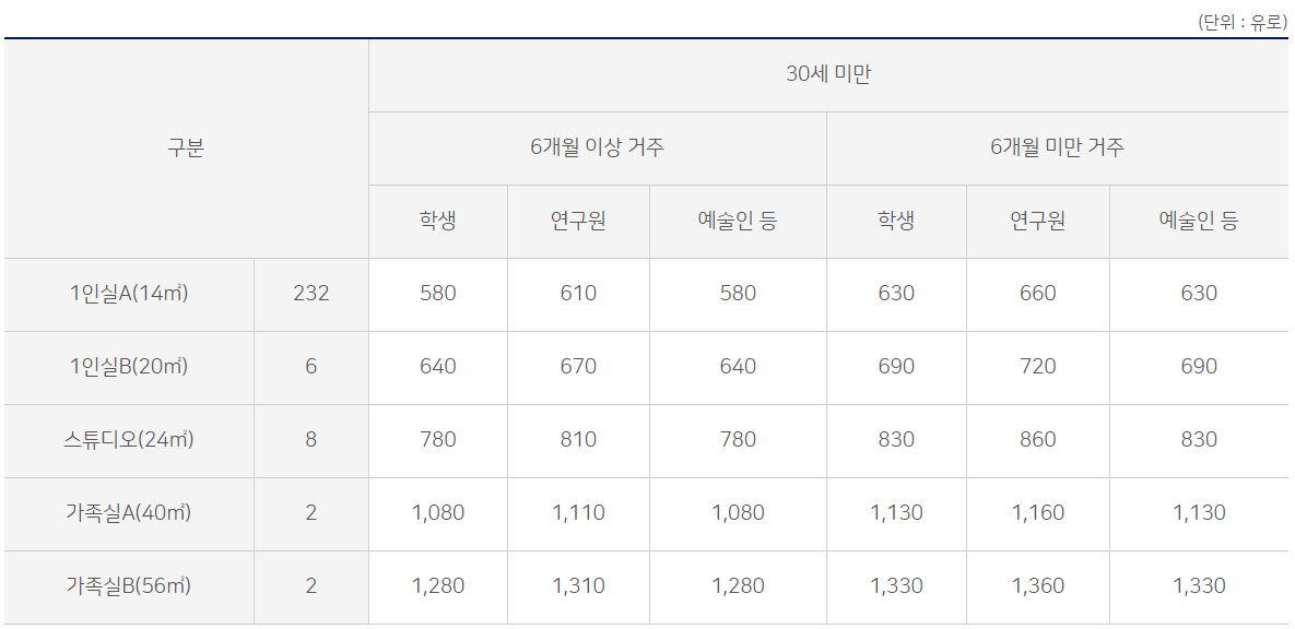 저는 현재 1인실을 사용하고 있고, 딱 6개월을 거주하기로 계약했기 때문에 한달에 580유로를 내고 있습니다