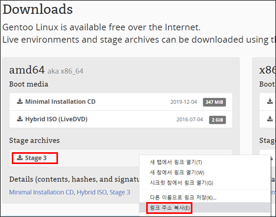 /home /bin /etc 등의 file system 구조를 형성해주기 위해 https://www.gentoo.org/downloads/에 존재하는 Stage3 파일의 링크 주소를 복사해준다