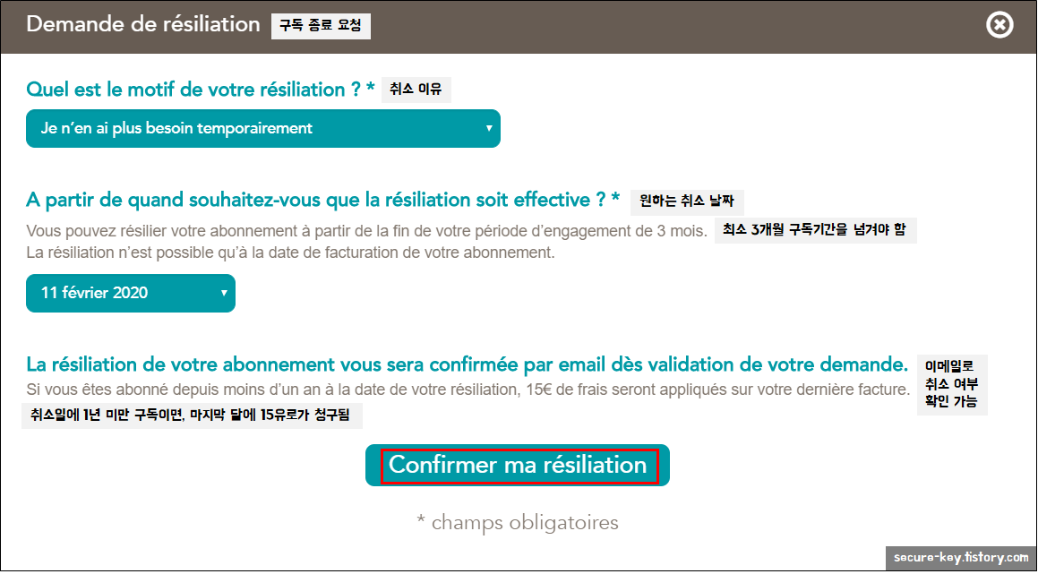 더이상 필요없다는 의미인 Je n'en ai plus besoin temporairement를 취소이유로 선택했습니다