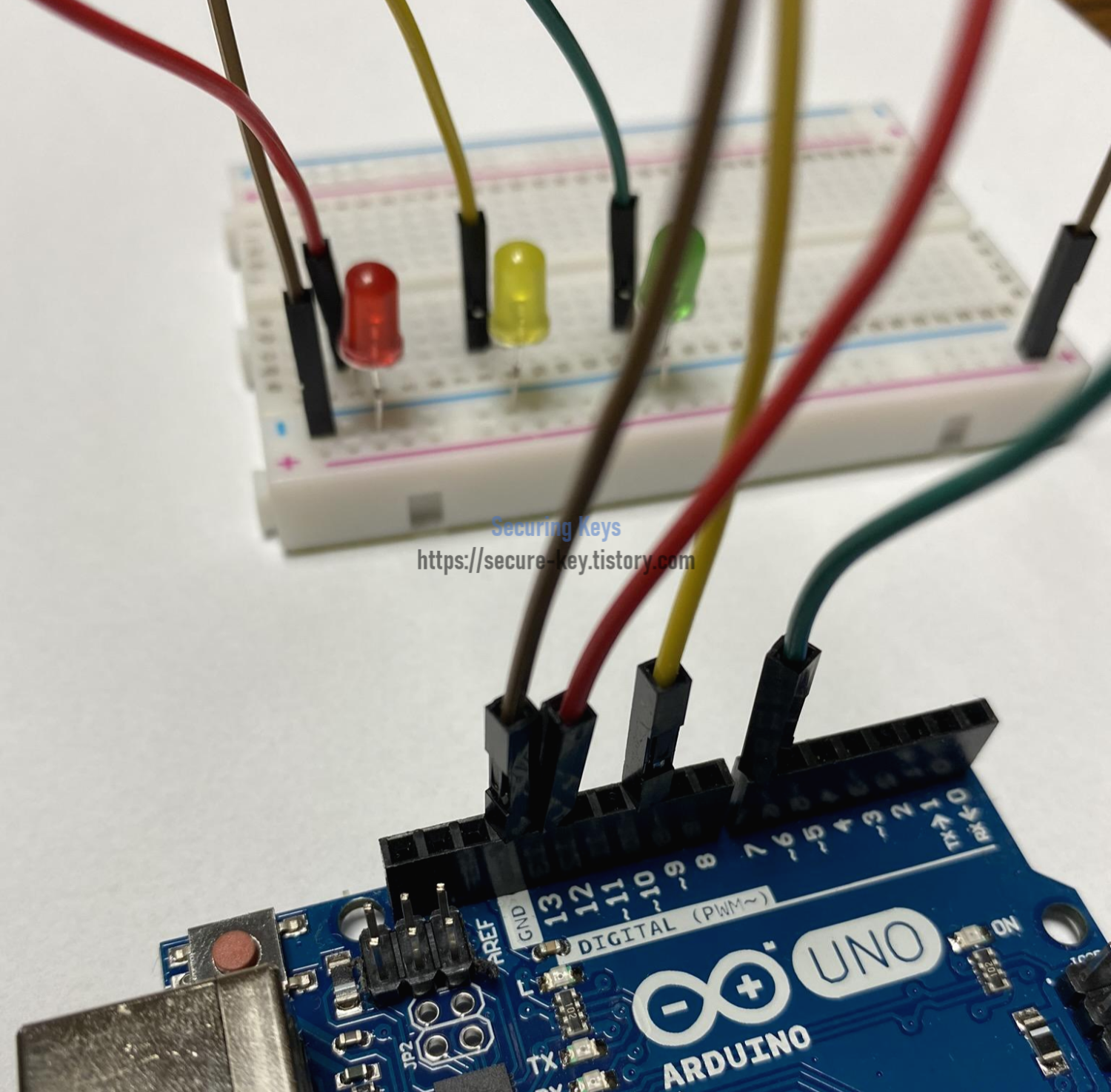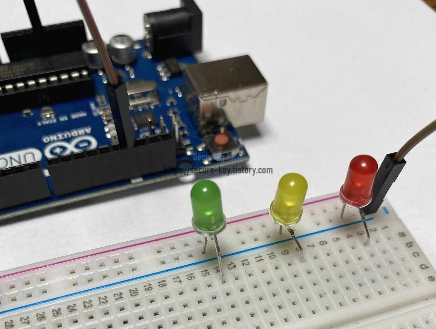 보기 쉽게 색깔에 맞는 선을 점퍼선을 연결해주었습니다. 빨간 LED는 디지털 13번에, 노란 LED는 디지털 10번에, 초록 LED는 디지털 7번에 연결했습니다.