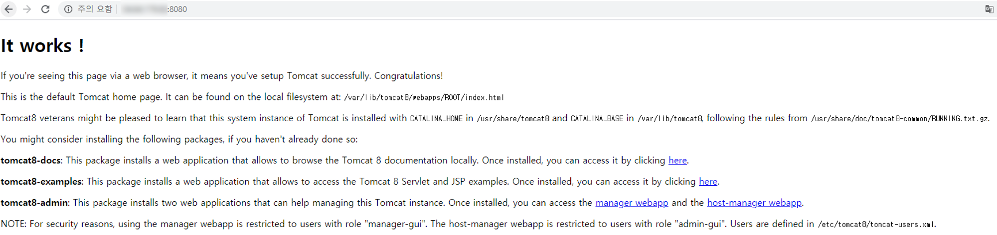 http://[외부 IP 주소]:8080으로 접속한 후, 위와 같은 화면이 뜬다면 성공입니다