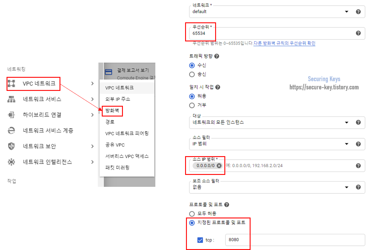 순서대로 들어간 후, 위와 같이 방화벽 규칙을 새로 설정해줍니다