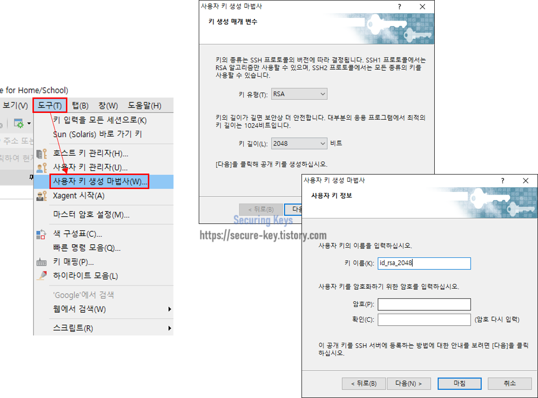 Xshell의 도구 > 사용자 키 생성 마법사 > RSA 2048비트 사용자 키 생성