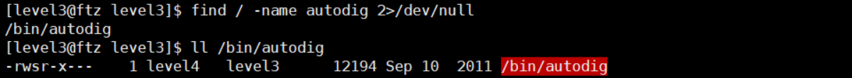 autodig로 된 파일을 찾아보니 역시나 autodig는 level4의 SUID가 걸려있는 실행파일이었다