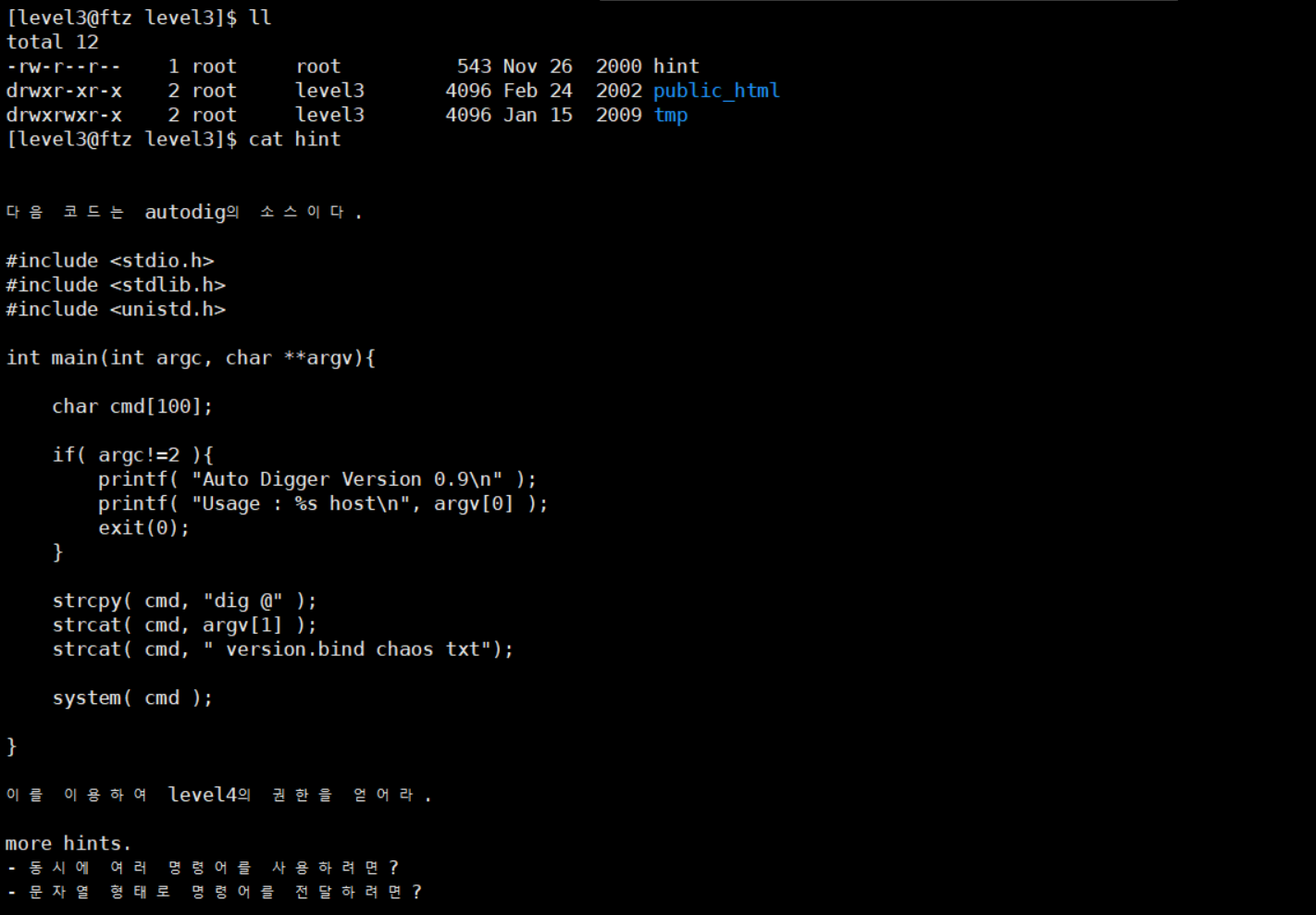 [FTZ] Level 3: SUID가 걸린 함수에 인자 전달로 명령 실행 본문