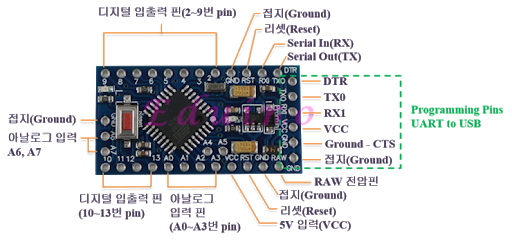 아두이노 미니 버전으로 3.3V 시스템이며 8Mhz 부트로더가 동작하는 '호환보드' 입니다.