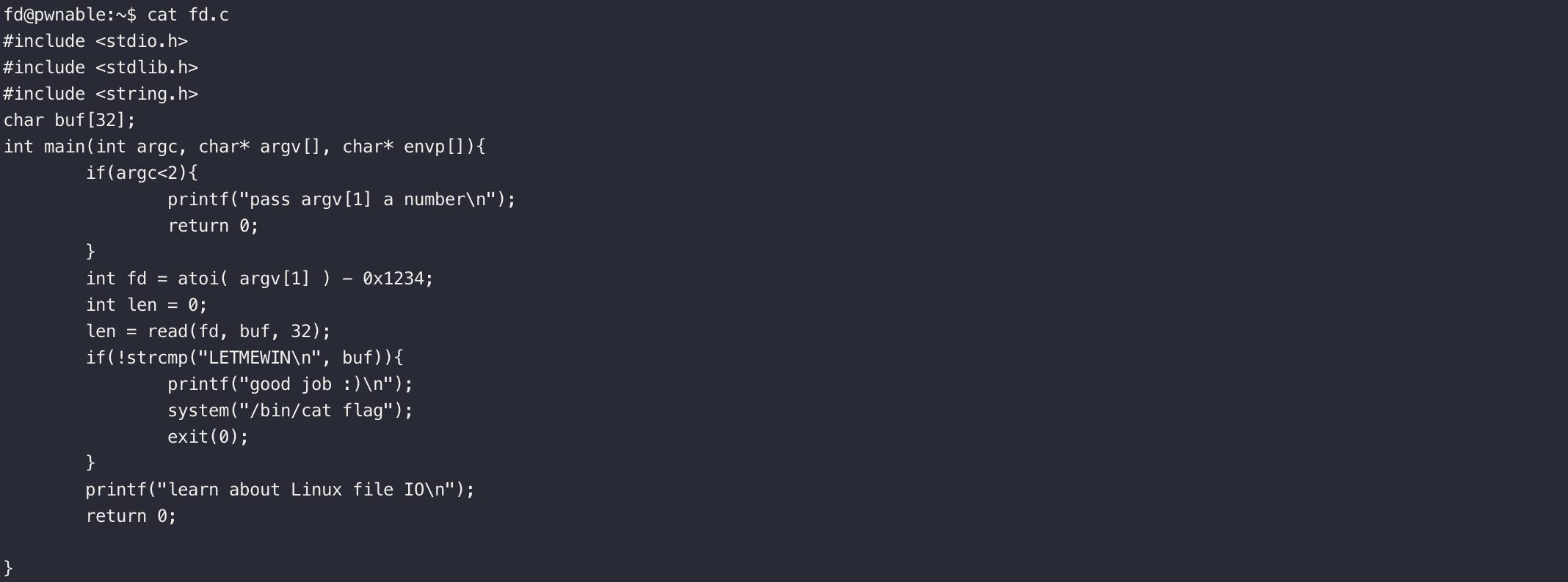 fd는 SetUID가 걸려있는 실행파일이었고, fd.c는 fd 실행파일의 코드였으며, flag를 우리가 궁극적으로 읽고자 하는 플래그값이 되겠다.