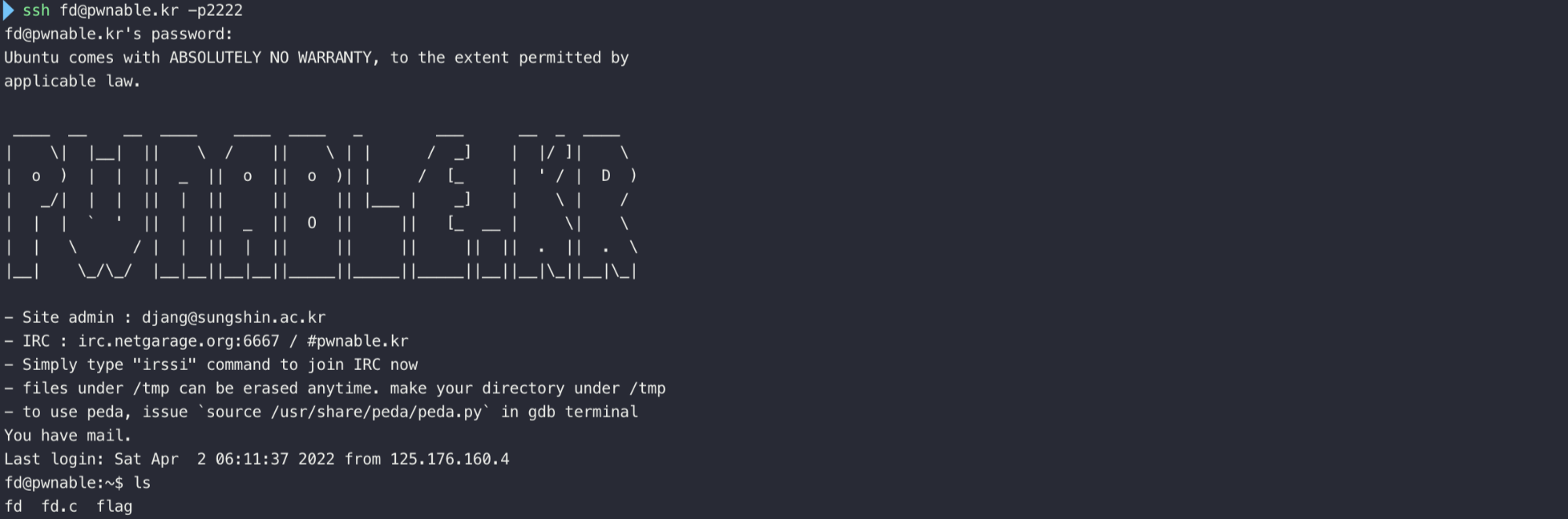 문제에서 알려준 쉘로 접속을 해보니, fd, fd.c, flag 파일이 존재하는 것을 확인할 수 있었다.