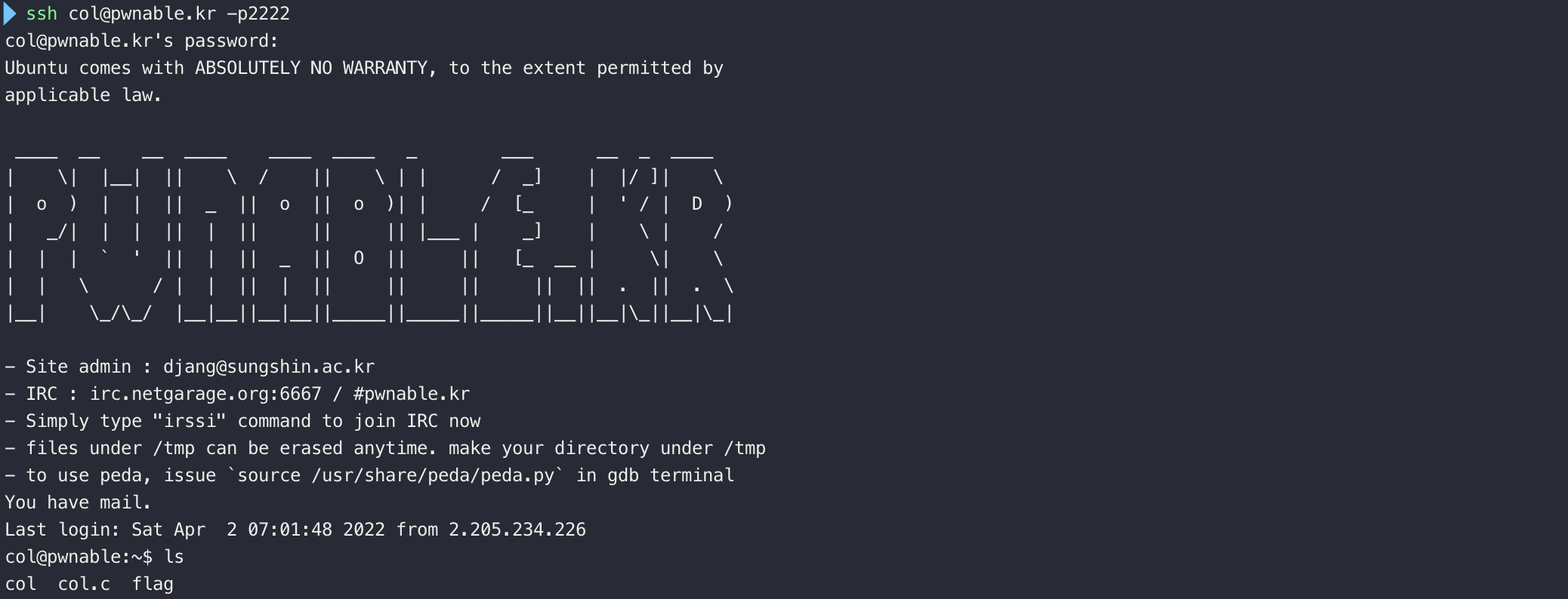 쉘에 접속하여 확인해보니 col 실행파일과 코드가 담겨져 있는 col.c, 그리고 궁극적으로 읽어야 하는 flag 파일이 있었다.