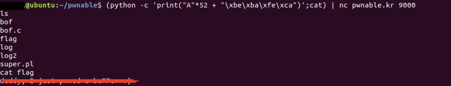 52byte만큼의 자리만 채워준 뒤에 0xcafebabe를 이어서 덧붙여주면 key 자리에 0xcafebabe가 overwrite될 것이다.
