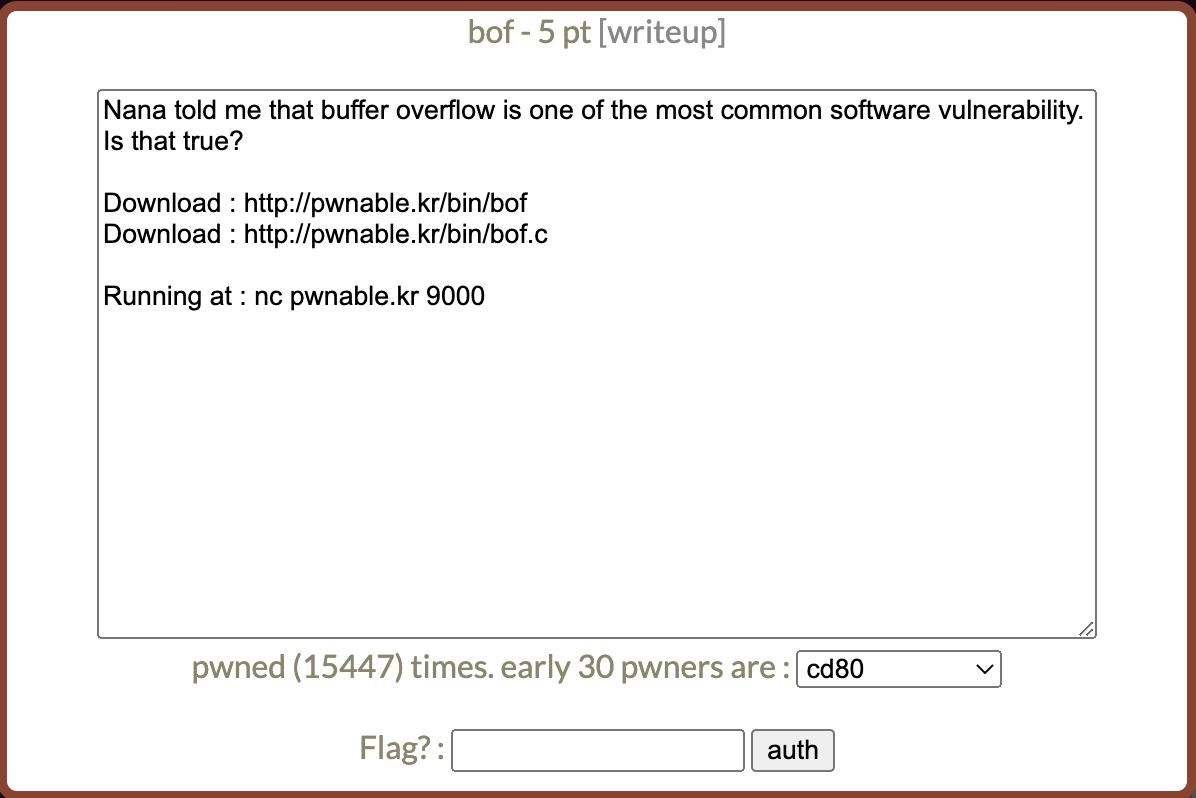 pwnable.kr 세번째 단계: bof 를 풀어보도록 하겠다.