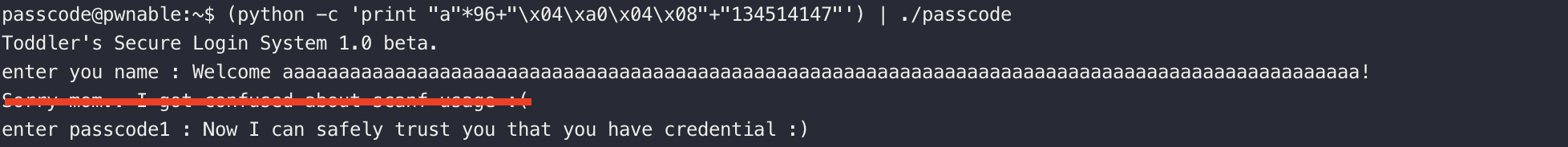 소스코드를 보면, passcode1과 passcode2를 scanf를 통해 입력값으로 받아들이는데, 입력값을 각 변수의 주소값에 저장하고, 이들은 초기화되어 있지 않기 때문에 문제에서 제시한 것과 같이 오류가 날 수 밖에 없다.